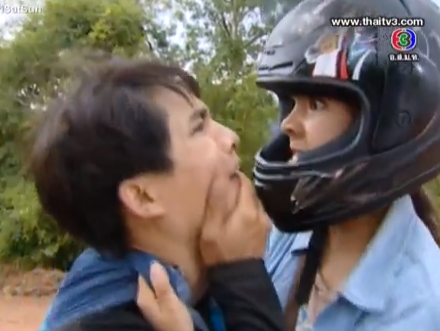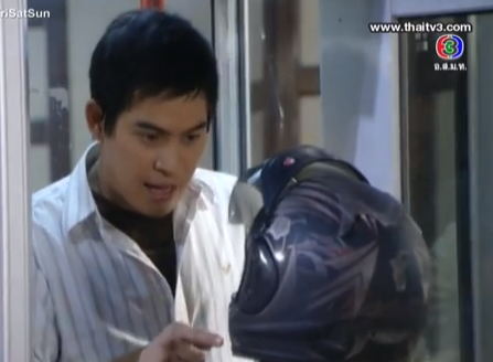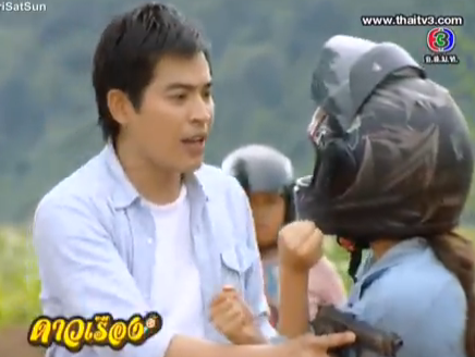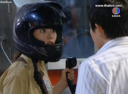 Reurng happens to hear his last sentence as she walks around the bend. She asks Gamjorn if he’s gossiping about her and he immediately says no, causing Khun Palat to look at him. Heh, even Gamjorn is afraid of Reurng. Khun Palat steps up and says that it’s a compliment to say she has a heart, not a gossip. Reurng tells her minion that she doesn’t want to have trouble with a stranger and proceeds to hop on her motorcycle. Khun Palat tells her that from now on, he is not a stranger to this town. Reurng surmises that he won’t last more than 7 days here. Does he wanna bet? Heh. Gamjorn sure does and whispers behind Palat’s shoulders on how much he would get back if he bets 200 baht.