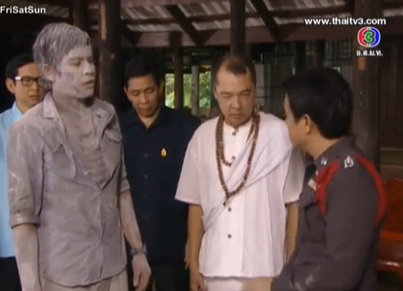 Meanwhile the first stop for Palat Jin is to visit the monk, to receive his blessings before starting his work in town. However after speaking to the monk, he discovers a big source of problem for this village. The monk says that people’s intentions have changed when they go to the temple now. Before people are there to cleanse and meditate, now they just want something out of the temple. We see Luang Taa next, an indication of how the people have changed: they are being taken advantaged of.
