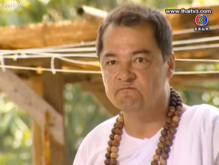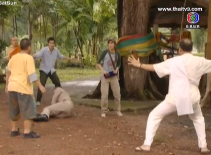 Luang Taa (the witch doctor) rushes into the proceedings wanting a good look at the culprit who tried to burn down his house. They ask Jin who hired him to do such a thing and Luang Taa surmises it must be Ai Reurng! Momma Bancheun steps in immediately, which causes Luang Taa to tell her that she’s beautiful but her daughter is cursed. The Sergeant lifts Jin to his feet and tries to be on eye level but the boy’s too tall so the Sergeant goes on tipsy toes. Heh.