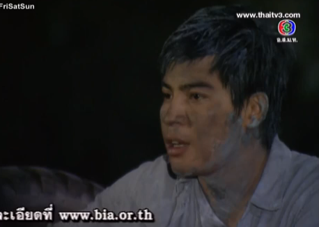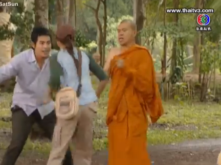 Reurng wants to report that Ai Wan has stolen the temple’s generator. Phoo Yai refuses to accept the allegations because his son went to the city for him, so therefore he couldn’t have stolen it. Palat Jin says that if there is no evidence, they can’t make any arrest. Reurng retorts that if the law can’t punish him, then she will have karma take over. She gives Phoo Yai a forewarning that people who steal from the temple won’t live so easily.