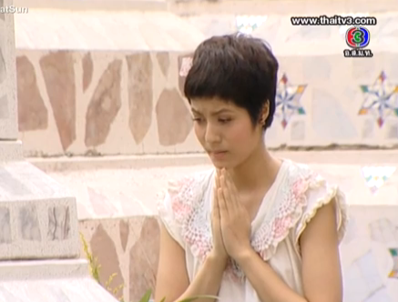 We hear Reurng and Little Pian’s voice from the ground level, calling out to the townsfolk to buy their betting tickets. Luang Taa tells her to solicit elsewhere, otherwise he would tell on her. How many times do people think threatening her about her mom would actually work? Reurng announces to the townsfolk that she will no longer accept purchases of lucky numbers from Luang Taa. Heh. The people scurry out of the temple to do as she bids.