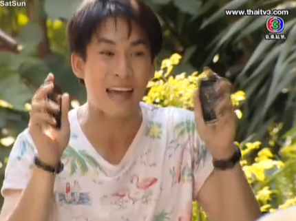 The trio retreat to find a way to make Reurng love him for real. One of his minions advises that girls love cell phones. If he could buy her one, heck, buy a couple’s phone, she would really fall for him. Trouble is, even though he’s Phoo Yai’s son, he doesn’t have any money. The minion whispers his idea to Ai Wan’s ear.