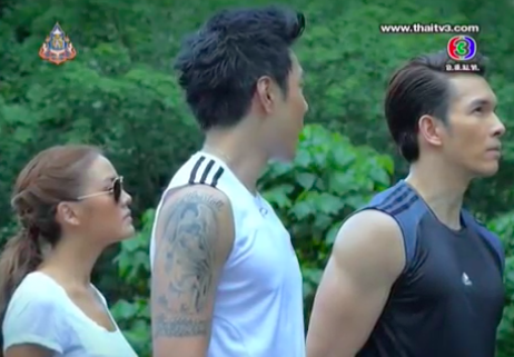 Since Dao has already agreed to go rock climbing with Pongjan, Chai Jan feels he must join them. But he’s never rock climbed before, having only entertained the gym. So pretty boy dusts his soft hands and prepares to rock climb. Pongjan gives a word of advice about the method of rock-climbing, and that Khun Chai should not let go of the rope (but he’s referring to Khun Chai’s possibility of letting go of Dao.) Ying Nim snipes that when her P’Chai has something in his grasp, he would not let it go.