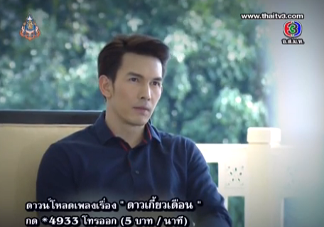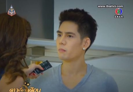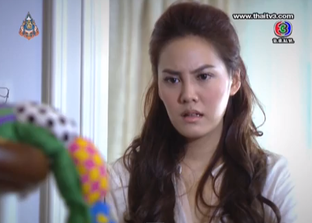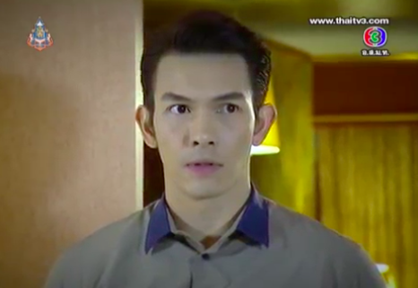 Siwa thinks Dao has revealed the voice recording evidence that he’s cheating on his wife, because he overhears a similar discussion in the living room, but it’s only his paranoia acting out because Arn is watching a lakorn on tv that happens to mirror his proposal to Dao earlier. As he inches closer, Arn rants that if she were the wife on TV, she would end his procreating days. She spots Siwa looking pale and immediately jumps to the conclusion that he’s hiding something from her. She makes him swear that if he’s truly lying, he would lose his sexual competence. Ha, she’s a scary wife.