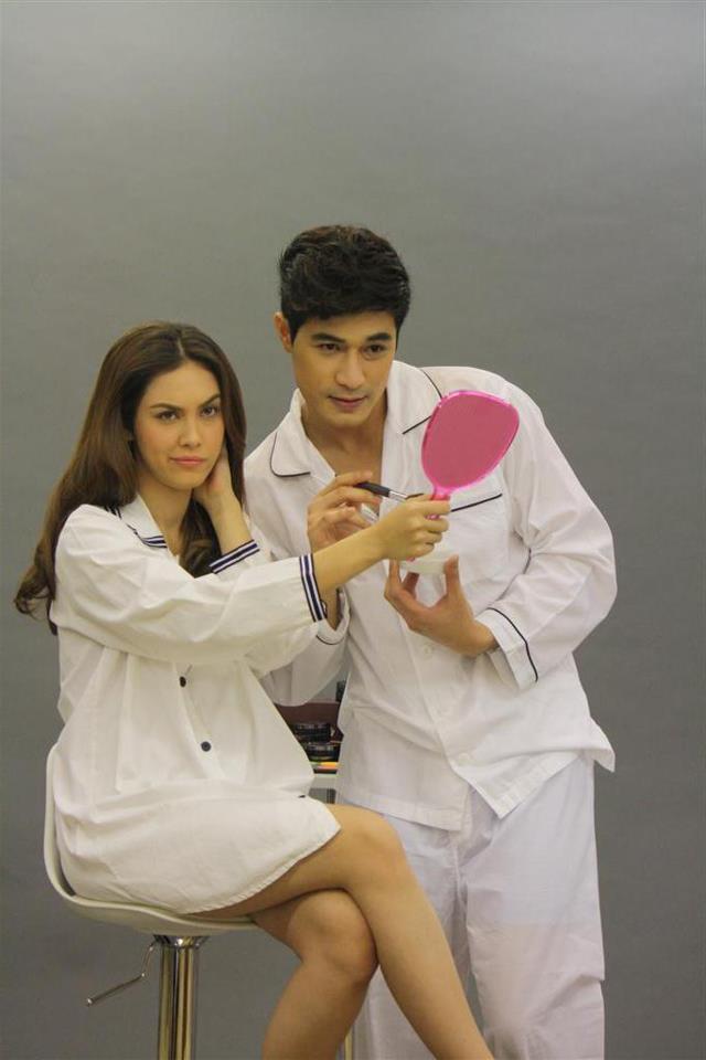 When Pete arrives to the photo shoot in the wheelchair all bandaged up, they ask him what happened? Pete tells Lookjun that he is bandaged because today he’s playing a scene where his character is injured. Lookjun comments that it looks so real and they did a great job of wrapping him up. He tells her that he misses her but she does not take him seriously because they just literally saw each other. After giving him a hug, Lookjun asks him when he sprayed on cologne. Pete tells her that he didn’t have it available earlier but made staff go buy it for him. Lookjun notices that Pete was struggling to apply makeup with the cast on his arm and suggest that they remove it. Pete and Ba Pa told her not to remove it because it would be hard to put it back on. After Jum’s make was done, she walked out and caused everyone to stare in awe at how she able to be transformed into a pretty girl.