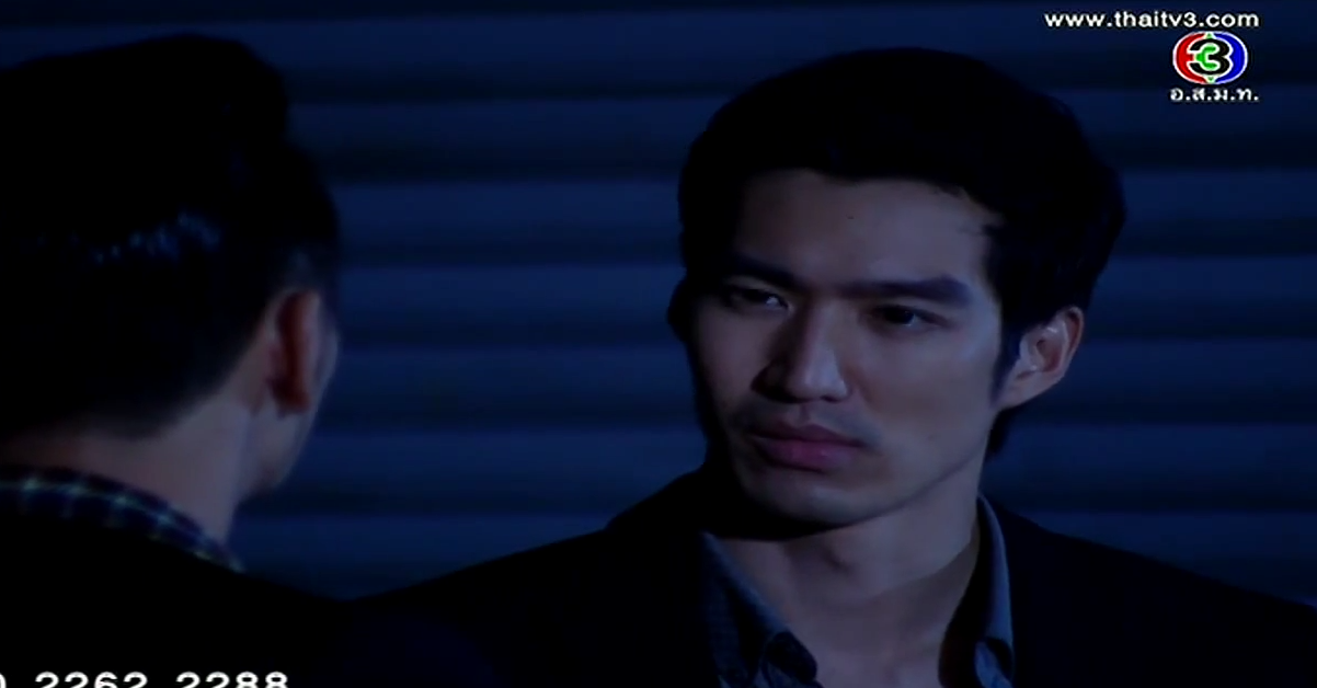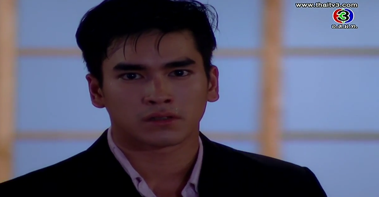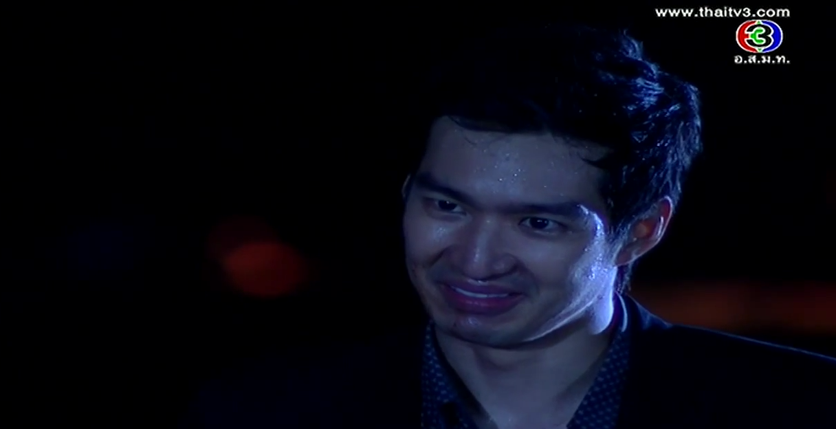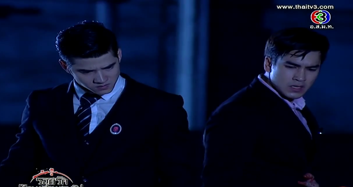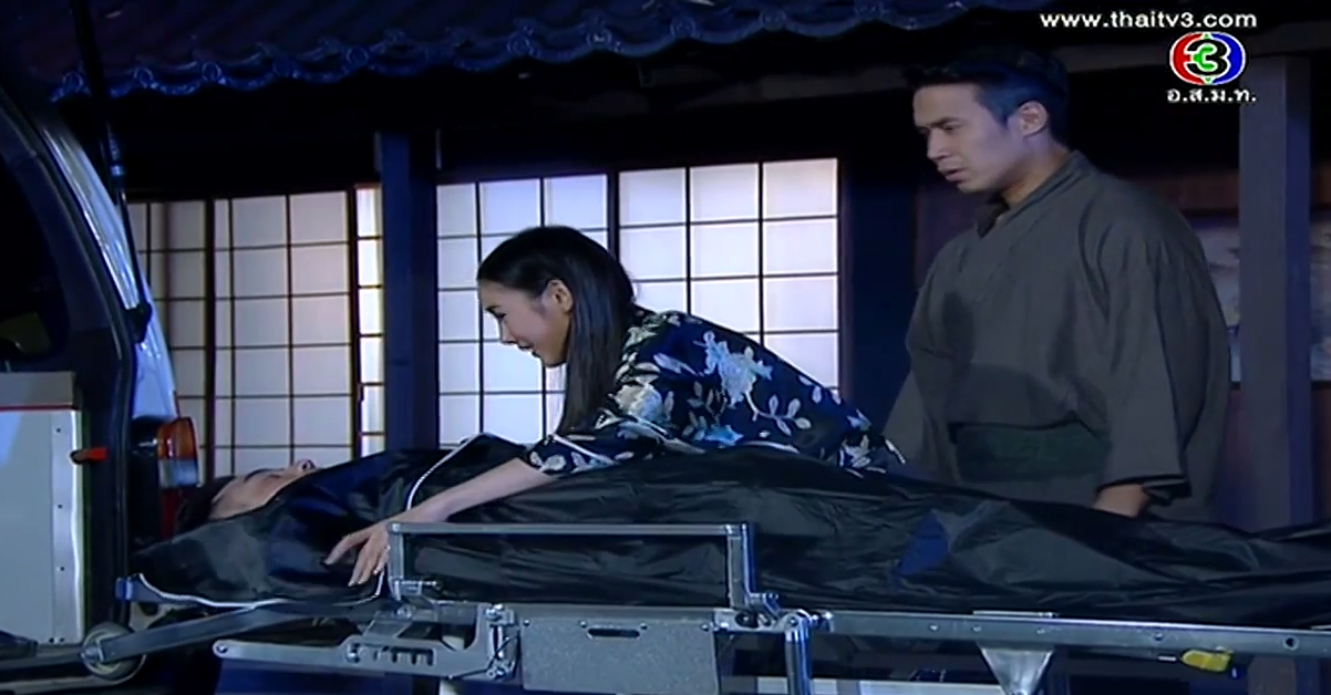 In the corner of the pier, Satoshi shows his face. Oh snap, he’s alive! We always knew in lakorn world, if the body isn’t found, most likely he’s not dead yet! He flashes back to Kenichi’s final comment and he vows that Misawa and Onitsuka will have to cooperate to kill Kenichi. Satoshi stumbles towards an incoming car until the second car stops for him. Ironically, he sees Onitsuka clan’s marking, and he orders them to take him to Sorel. But along the way, the car stops as Kenichi approaches him. Oh, he’s a goner for sure now. We even have a body to prove it. Misawa stares at his son’s corpse and vows that whoever killed his son will die a horrible death. Aiko shouts that Takeshi will never kill her brother.