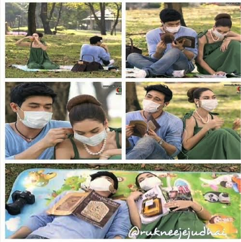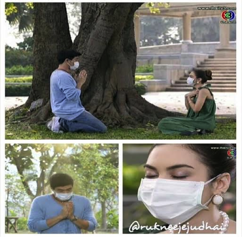 After that they decide to have a picnic out on the lawn. (omg this Lakorn is really something, they really do cleverly think of the funniest outrageous things for our characters to do.) In this scene Lookjun and Paul take turns feeding each other by lifting up their face masks. It’s brilliant, funny, and very original. After another doctor’s visit that afternoon, we see Lookjun balling her eyes out making us assume that Paul’s illness has gotten worse, but they were informed that the original diagnosis was incorrect. He just has a small infection and dampness in his lungs, it’s not the contagious disease. Paul asked her why she was crying when it’s good news, she tells him that she’s crying because she’s so happy that it wasn’t something serious and he’s going to be okay. Paul removes their masks and gives her a sweet hug.