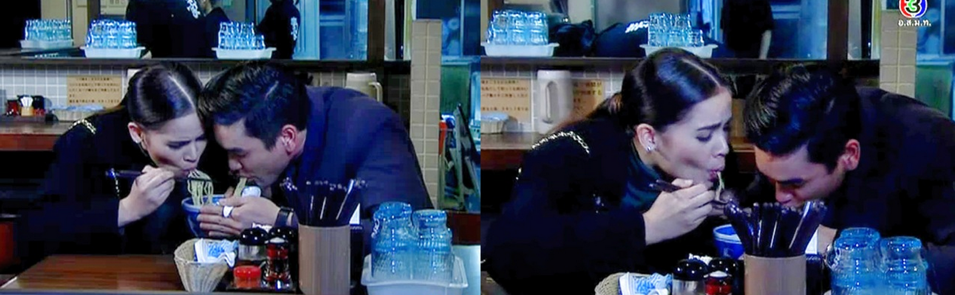 Mayumi finds herself at a quaint and quiet café, she states that she wants to go HOME. He teases her that she only knows how to say one thing, like a parrot. Lol. And that the 7 years is behind them now – they have settled matters of the heart – so now they should settle matters of the.. stomach? She looks irritatingly at him but doesn’t argue that the bowl of ramen doesn’t look delicious. Before he has her dig in (sharing the same bowl) he chants a prayer into the bowl that he wishes for Dr. Mayumi to fall in love with him once she eats it.
