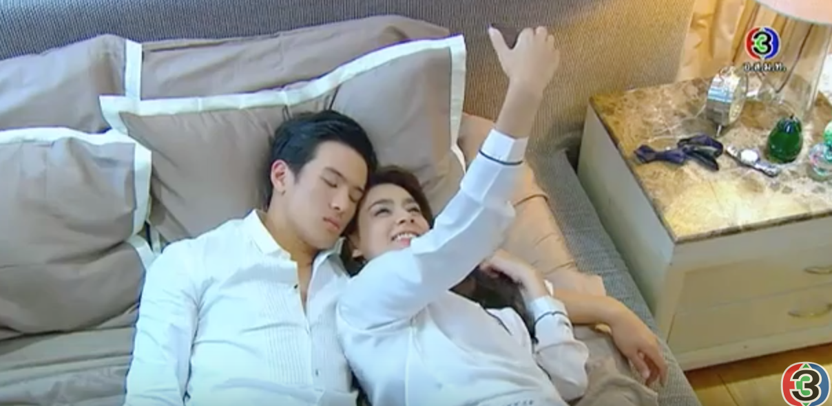 Satawat falls asleep on the bed as Anusaniya changes into her pajamas. She tries to wake him to no avail. At the same time, she notices a text message coming in for him and takes a peek. It’s Soamika! Intending to ruin their wedding night by sending him emojis. Anusaniya, bless her petty heart, snuggles into the good doctor’s arms and starts taking sweet pictures of them. She sends those pictures to Soamika who nearly bursts a blood vessel. Hahaha.