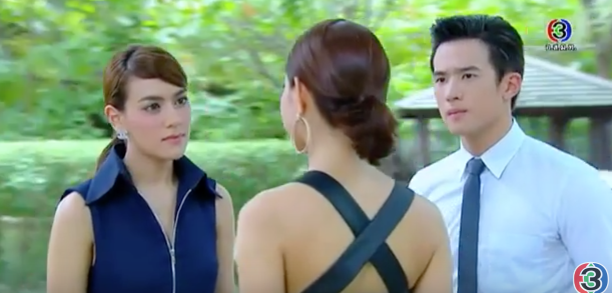 Khun Lek gets his girl pregnant and she tells him to take responsibility for it. She threatens to go to his sister but Khun Lek warns her that Anusaniya won’t be understanding at all, in fact, she might get her ass fired instead. Gina decides to tell Chayakorn about this, who later seeks out Anusaniya at home to share the news. Unfortunately Satawat comes home and sees them conversing in the yard. All he hears is Anusaniya instructing Chayakorn not to tell anyone, especially her father because she doesn’t want him to get stressed out. Chayakorn agrees, and warns her not to tell her husband either. Chayakorn says if it is true, the child will be born into a set of issues. He promises not to leave her to figure out this issue alone. This doesn’t look good.