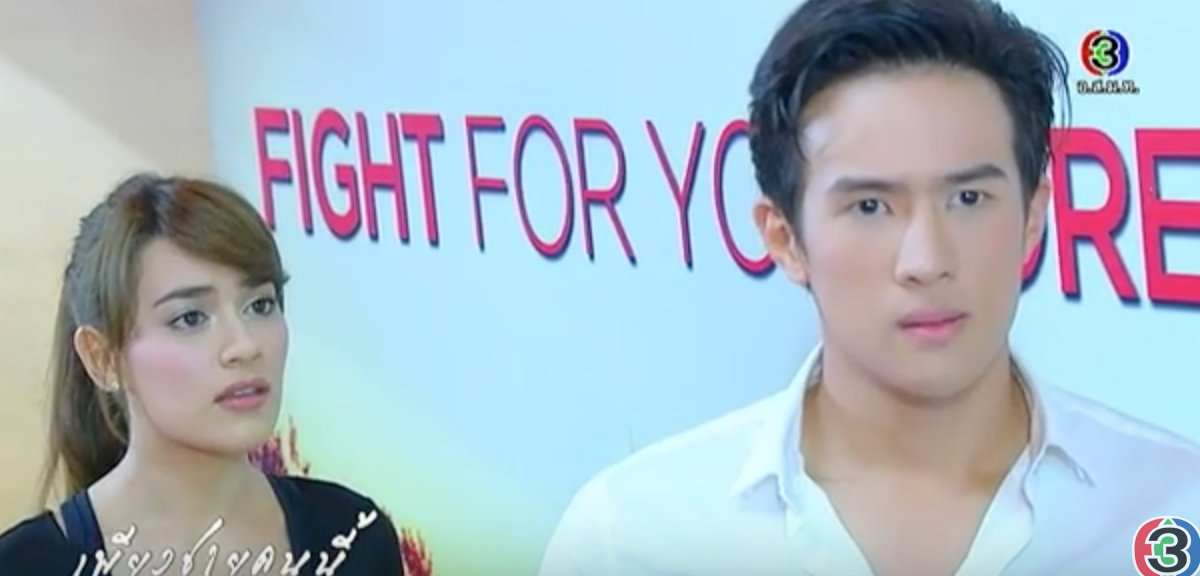 Satawat goes to the gym and spots Chayakorn sitting alone. He thinks to himself that they must have made arrangement to meet. His blood is already boiling and Chayakorn doesn’t help matters by fueling the fire. It’s not a subtle thing to dress Chaya in black and Wat in white, in case you didn’t already know who the hero in this show is. The two exchange punches until Anusaniya breaks them up.