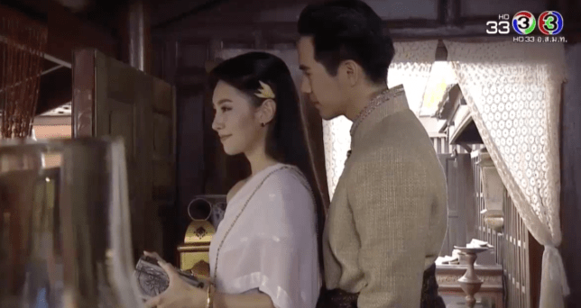 And finally, HE’S BACK! Phor Daed, looking so fine and more mature. The pillow also made its appearance back. The two can’t seem to keep their eyes from each other until Khun Ying relents they should prepare a meal for Phor Daed. As Katesurang brings him some tea, he looks up at her and notices that she seems.. full? Lol. Katesurang immediately thinks she must have gained some weight, but Phor Daed smiles and says she’s lively and beautiful. The way he looks at her, it’s like he’s looking at every inch of her face. Katesurang asks him how he fared in the cold country. Phor Daed tells her that he’s kept warm thanks to the clothes she made. He gives her one of those looks again and says he brought a gift for her. In an antique box, Katesurang’s face light up, she wonders if it’s perfume or jewelry. Phor Daed says that it’s a book. Haha. Her face falls slightly but she thanks him for the gift anyway. Phor Daed stands his close stance next to her (as per his usual, swoony move) and tells her that he didn’t bring any French smells with him and did not get involved with a French woman.