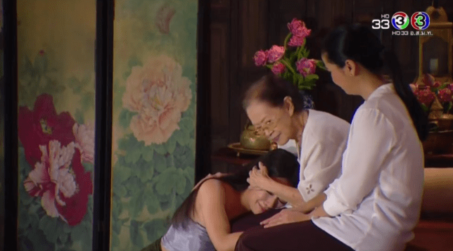 Next Katesurang receives another breaking news: she has a twin sister. Mom says that her twin sister died and they hoped she would survive, but now they’ve lost her too. Wait, what? Katsurang says she wants to hear more about this. Me too! But mom says that 20+ years with her isn’t enough, while grandma says they got 20+ years with her. Mom also says that she feels badly for Reungrit because he’s going to ordain forever. Another, “wait, what?” from yours truly. Sounds eerily familiar.