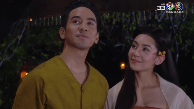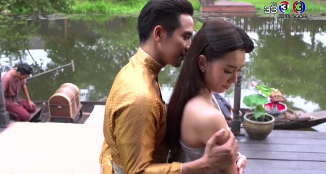 We open this episode with Katesurang playing matchmaker. She instructs Khun Reung to visit Mae Ying Janwat while her mom isn’t around. So on a lucky day, he finally gets her alone. He tells her immediately that there is someone whom he thinks about everyday. This seems to catch her off guard, but Mae Ying continues that she knows who he misses, and guesses it must be Mae Karakate. Khun Reung quickly clarifies that he misses Mae Ying Janwat.. not Mae Ying Karakate. Haha. But Mae Ying Janwat isn’t stupid as she relents that since he wasn’t being clear earlier, she had to feign ignorance. Khun Reung thinks she’s the most adorable woman for saying this, and Mae Ying adds that he has told her how he feels by his actions. He acknowledges that he loves her and takes her hand, questioning if she feels the same way. Sometimes you need to hear it to be sure. Mae Ying simply giggles, because time hasn’t changed for men, has it?